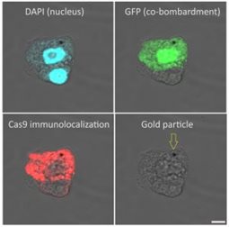 Immunolocalization of Cas9 on maize (Zea mays, cv. H1233) plant suspension cultures. (red) are used for immunodetection following formaldehyde fixation, cell wall digestion and detergent permeabilization of cells. DAPI is used as nuclear marker (blue). Gold particle used for microprojectile bombardment of plasmids (GFP and Cas9) is indicated with an arrow at the last column. Scalebar is 5μm.