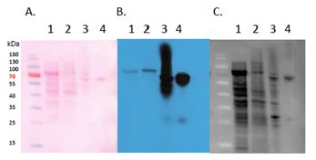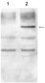 100 μg of total protein from Arabidopsis thalianawild-type(1) and transgenic plants expressing GUS under HRT promoter (2) were extracted with write buffer containing 50 mM Tris-HCl pH 7.5, 150 mM NaCl, 10 mM MgCl2, 5 mM EDTA, 10% glycerol, 0.1% NP-40, 0.1% protease inhibitor cocktail