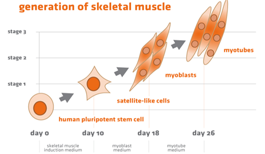 Myocea的Skeletal Muscle Differentiation Kit是世界首款能將hPSCs分化為骨骼肌細胞的商品化培養(yǎng)基系統(tǒng),由四個培養(yǎng)基組成。通常情況下,從人多能干細胞生成肌細胞需要3個階段(如上圖),即依次生成衛(wèi)星樣祖細胞(satelite-like progenitor cells)和成肌細胞(myoblasts),最后融合成為多核肌管細胞(multinucleated myotubes)。因此Skeletal Muscle Differentiation Kit包含了三個分化階段所需的三種培養(yǎng)基,此外它還提供了一個促進肌管融合的培養(yǎng)基作為可選組分,可根據(jù)研究者希望得到的細胞表型靈活選擇。骨骼肌分化系統(tǒng)的四個培養(yǎng)基詳情見下表。