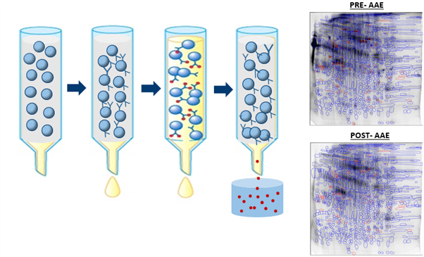 現(xiàn)階段,常用的HCP抗體覆蓋率驗(yàn)證的方法都存在其自身的局限性。AAE方法解決了傳統(tǒng)2DWB中的低靈敏度和低特異性的問(wèn)題。而且,由于AAE可以在富集本身含量較低的HCP的同時(shí),還可以大幅降低中間品和終產(chǎn)品中的藥物蛋白。這使對(duì)中間品和終產(chǎn)品中HCP與HCP抗體的反應(yīng)情況的分析成為可能。盡管如此,AAE和銀染分析也不能具體得知樣品中具體有哪些種類的HCP,尤其是那些與人體有較高免疫原性和對(duì)藥物有較大影響的HCP?;谝陨蠁?wèn)題的考慮,Cygnus利用更精準(zhǔn)的質(zhì)譜檢測(cè)方法與AAE相結(jié)合,推出了新一代的AAE和Mass Spectrum覆蓋率驗(yàn)證服務(wù)。