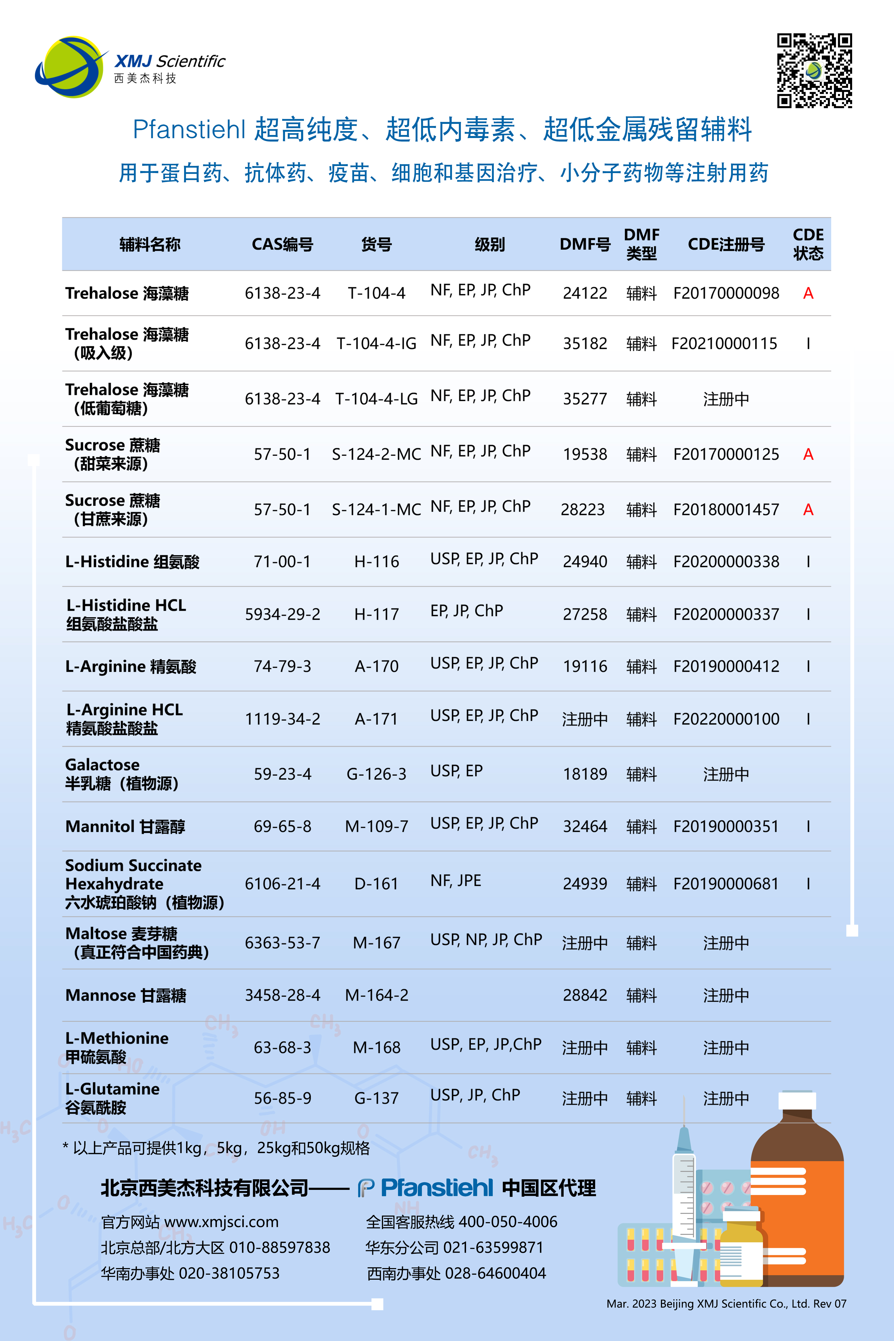 Pfanstiehl致力于為全球生物制劑公司提供高質(zhì)量注射級藥用輔料,主要產(chǎn)品包括注射級海藻糖(T-104-4)、蔗糖(S-124-2-MC和S-124-1-MC)、甘露醇(M-109-7)、六水琥珀酸鈉(D-161)、組氨酸(H-116)、組氨酸鹽酸鹽(H-117)、精氨酸(A-170)、精氨酸鹽酸鹽(A-171)等,并已獲得CDE藥用輔料注冊號,其中海藻糖和蔗糖已經(jīng)處于激活狀態(tài)。