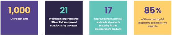 英國(guó)Astrea Bioseparations于1987年成立,公司前身是Affinity Chromoatography Ltd,其從英國(guó)劍橋大學(xué)獨(dú)立出來(lái)專注于吸附填料的研發(fā)和生產(chǎn)。Astrea Bioseparations 公司兩大核心專利技術(shù)(產(chǎn)品)Mimetic ligand® 和PuraBead® 是公司產(chǎn)品的基石,迄今為止已有21個(gè)上市產(chǎn)品(FDA/EMA) 使用 Astrea Bioseparations公司的產(chǎn)品用于商業(yè)化生產(chǎn),其中不乏跨國(guó)公司和新興生物技術(shù)公司。
