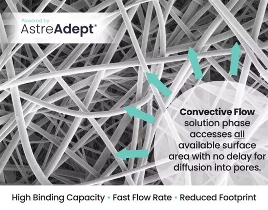 近年來(lái),隨著CGT領(lǐng)域的興起,病毒載體的純化面臨著諸多技術(shù)瓶頸,Astrea Bioseparations 致力于開(kāi)發(fā)一種用于病毒載體高效純化的新型生物分離材料AstreAdept®。AstreAdept ®是一種靜電紡絲復(fù)合納米纖維層析膜,具有較大的開(kāi)放結(jié)構(gòu),幾乎可以瞬時(shí)結(jié)合大目標(biāo)(包括病毒載體)到更大的結(jié)合表面積。