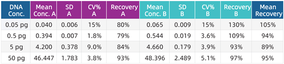 準(zhǔn)確性與可重復(fù)性測試。由兩名操作員(A和B)分別在兩天內(nèi)對(duì)已知DNA樣本進(jìn)行兩次檢測,計(jì)算檢測結(jié)果的SD, CV和回收率%(見下表)。