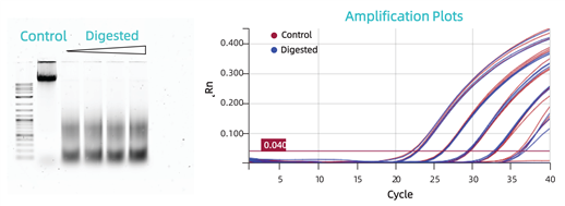 完整的和不同程度降解的CHO DNA的提取與擴(kuò)增效果對(duì)比。將完整的gDNA(Control)與分別用Alu1酶處理30min、1h、1.5h和2h后的DNA(Digested)凝膠電泳圖像。對(duì)照組和酶處理30min組樣品擴(kuò)增的線性范圍基本一致(如下圖)。