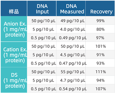 過程樣品與藥物原液(DS)檢測結(jié)果對(duì)比。對(duì)比含有1 mg/mL陰離子交換或陽離子交換純化的蛋白樣品或藥物蛋白的CHO DNA回收率(見下表)。
