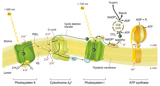 植物光合作包括光能的吸收、能量轉(zhuǎn)換、電子傳遞、ATP的合成以及CO2的固定等步驟,這一過(guò)程主要在植物的葉綠體的類囊體膜上完成的。類囊體膜上存在四種關(guān)鍵的蛋白復(fù)合體:光系統(tǒng)II(PS II)、Cytb6/f復(fù)合體、光系統(tǒng)I(PS I)和ATP合成酶,這四種復(fù)合體協(xié)同作用,共同完成光反應(yīng)。光系統(tǒng)II上具有捕光色素復(fù)合體(LHC)構(gòu)成的天線系統(tǒng),可以捕獲光能,而光系統(tǒng)I則利捕獲后的能量進(jìn)行原初光化學(xué)反應(yīng)。Cytb6/f復(fù)合體在電子傳遞過(guò)程中起著至關(guān)重要的作用,ATP合成酶則負(fù)責(zé)合成ATP,為植物細(xì)胞提供能量。