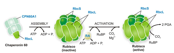 CO2的固定是利用光反應(yīng)產(chǎn)生的ATP和NADPH合成有機(jī)物的過(guò)程,該過(guò)程稱為卡爾文循環(huán)。1,5二磷酸核酮糖羧化/加氧酶(Rubisco)是CO2固定過(guò)程中的關(guān)鍵限速酶,催化CO2和RuBP(核酮糖-1,5-二磷酸)發(fā)生羧化、然后裂解形成兩個(gè)PGA(甘油酸-3-磷酸)分子。所有光合生物都具有由8個(gè)大亞基RbcL和8個(gè)小亞基Rbcs組成的I型Rubisco,且RbcL折疊到其天然狀態(tài)依賴于葉綠體定位的分子伴侶CPN60的作用。