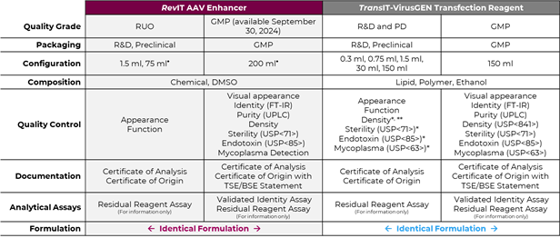 RevIT? AAV Enhancer于2024年9月30日推出GMP級(jí)別,由ISO 13485體系認(rèn)證的工廠生產(chǎn),符合ISO 20399以及USP<1043>標(biāo)準(zhǔn)。自2023年7月28上市的RevIT? AAV Enhancer,已證明在不同血清型、細(xì)胞培養(yǎng)基以及轉(zhuǎn)染平臺(tái)上,可提高至少2-4倍病毒滴度;在保持高質(zhì)量滴度的同時(shí),允許更低質(zhì)粒DNA用量,從而大幅度降低AAV病毒生產(chǎn)成本。