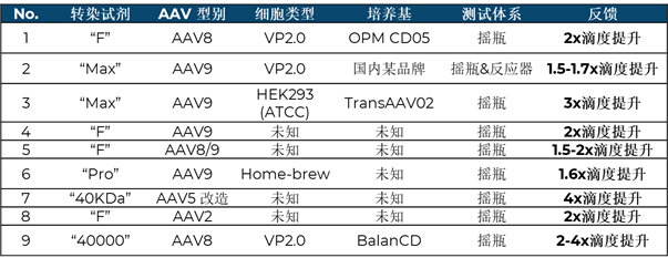Mirus Bio成立于1996年,在核酸遞送領(lǐng)域深耕多年,于2021年8月推出GMP級(jí)別TransIT-VirusGEN® GMP 轉(zhuǎn)染試劑,支持AAV及LV從科研到GMP商業(yè)化生產(chǎn)。不同于傳統(tǒng)基于單組分的轉(zhuǎn)染試劑(如陽(yáng)離子聚合物聚乙烯亞胺,PEI),Mirus Bio將專利的多聚物及脂質(zhì)技術(shù)進(jìn)行多重組合,形成多功能性的轉(zhuǎn)染方案,克服細(xì)胞遞轉(zhuǎn)過(guò)程中的多重阻礙,以實(shí)現(xiàn)更高效轉(zhuǎn)染和更低細(xì)胞毒性,從而大幅度提升多種血清型AAV病毒生產(chǎn)載量。去年7月底Mirus上市RevIT? AAV Enhancer,已證明在不同AAV血清型別中,可提高AAV病毒基因組滴度1.2-4.9倍,并且在一定程度改善了實(shí)心率。更重要的是,RevIT? AAV Enhancer不僅可以搭配Mirus TransIT-VirusGEN® GMP 轉(zhuǎn)染試劑,也適配于其他轉(zhuǎn)染試(如PEI等),使得AAV生產(chǎn)上游成本的進(jìn)一步降低成為可能,進(jìn)而降低了基因治療單劑量成本。下圖展示了國(guó)內(nèi)客戶前期測(cè)試反饋結(jié)果,測(cè)試包括了不同血清型別的質(zhì)粒設(shè)計(jì),適用于國(guó)內(nèi)及國(guó)外品牌的轉(zhuǎn)染試劑、細(xì)胞及培養(yǎng)基體系,實(shí)現(xiàn)了1.5-4倍以上的AAV病毒滴度提升。