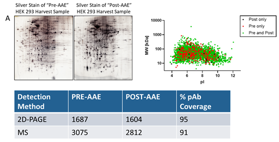 AAE-MS?也可以對(duì)藥物原液中HCPs富集的同時(shí)去除了大部分原料藥。去除原料藥極大地提高了通過2D-PAGE和質(zhì)譜分析識(shí)別單個(gè)HCPs的能力,因?yàn)樗幤吠ǔR?/span>104-106的倍數(shù)掩蓋HCPs。AAE-MS?是一種更客觀和直接的方法檢測(cè)和鑒定原料藥中任何潛在的HCPs雜質(zhì)以幫助優(yōu)化下游純化工藝。