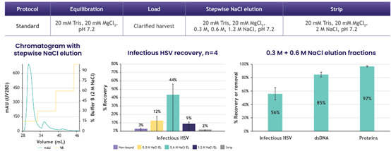 感染性HSV回收率為56%,LentiHERO®載量可達(dá)9.2E+9 IU/ml,大部分感染性HSV在0.6M NaCl條件下被洗脫。