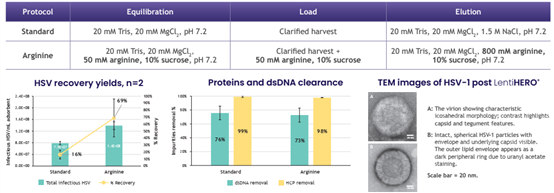 用0.8M精氨酸洗脫,HSV回收率可達(dá)到69%,LentiHERO®載量可達(dá)1.4E+8 IU/ml,同時(shí)實(shí)現(xiàn)高效的雜質(zhì)去除。