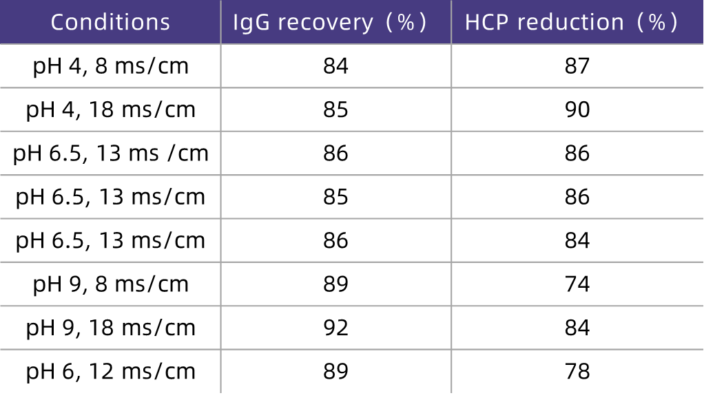 As can be seen from the test results in Figure 2, under the loading conditions of lower pH (6.0) and lower conductivity (6 mS/cm), the HCP removal effect is optimal, and the recovery rate of the target molecule Vκ is the highest. Under the optimal loading conditions, the HCP in the feed solution can be reduced from 30,000 ppm to 200 ppm (representing an HCP removal capacity of 2 log values), and the Vκ recovery rate exceeds 85% (Table 2).