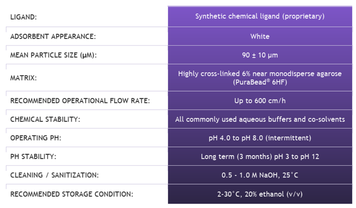 HCPure? is a multimodal chromatography resin launched by Astrea Bioseparations (UK) in 2023. The resin matrix is composed of highly cross-linked agarose with a uniform particle size, and the matrix is modified with chemically synthesized small-molecule ligands (Figure 1). It mainly binds impurities in the feed solution through hydrophobic interactions, while also exhibiting hydrogen bonding interaction mode—this differs from the mechanism of action of mainstream commercially available products and thus forms a complementary solution. Suitable for a variety of expression systems, HCPure? can robustly remove process-related or product-related impurities such as host cell proteins (HCP), host cell DNA (HCD), aggregates, and molecular fragments from the feed solution under a wide range of loading conditions. Table 1 shows the impurity removal capacity of HCPure? in common expression systems.